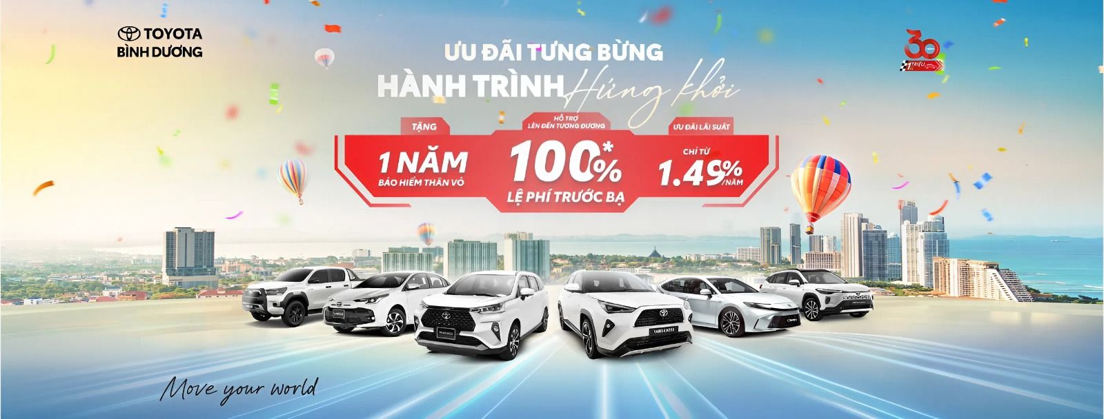 Giảm 100% thuế trước bạ dòng xe Vios, Veloz Cross và Avanza Premio, hỗ trợ trả góp lãi suất 1.99%, hỗ trợ đăng ký xe nhanh chóng, đa dạng mẫu và màu xe giao ngay tất cả sẽ có tại khuyến mãi mới nhất của Toyota Bình Dương - Thành phố Mới.